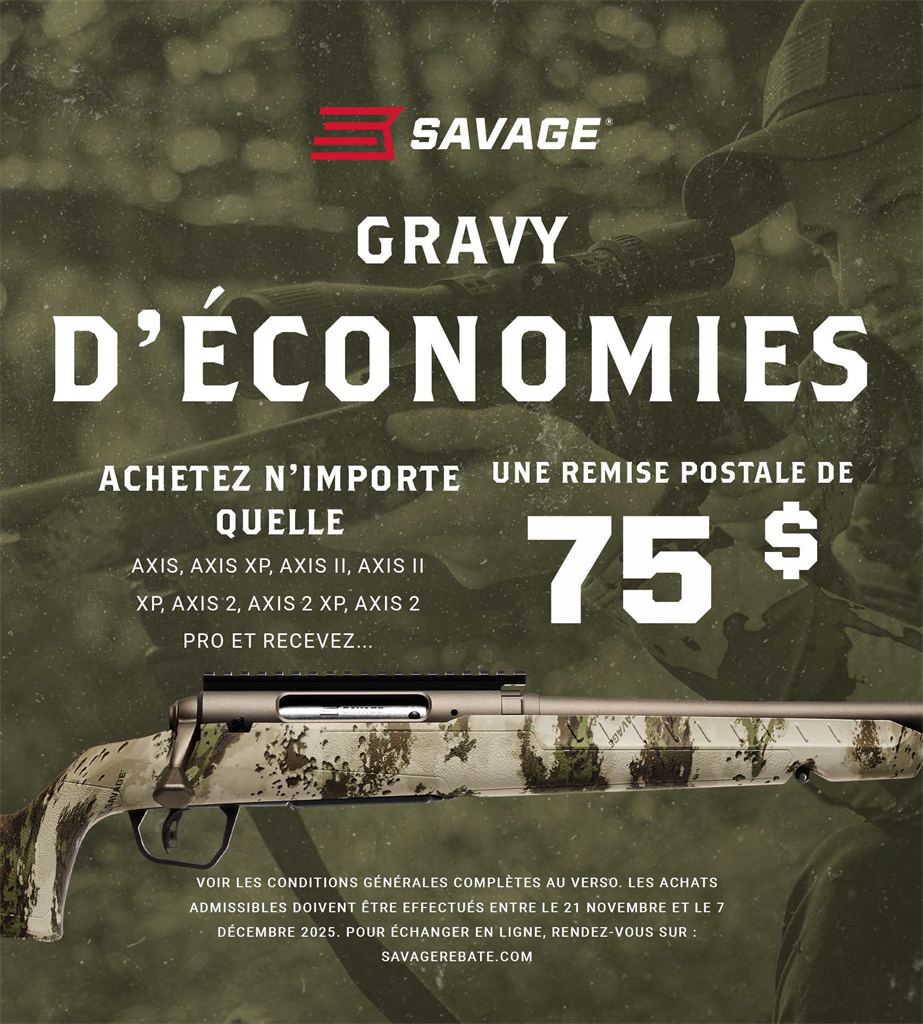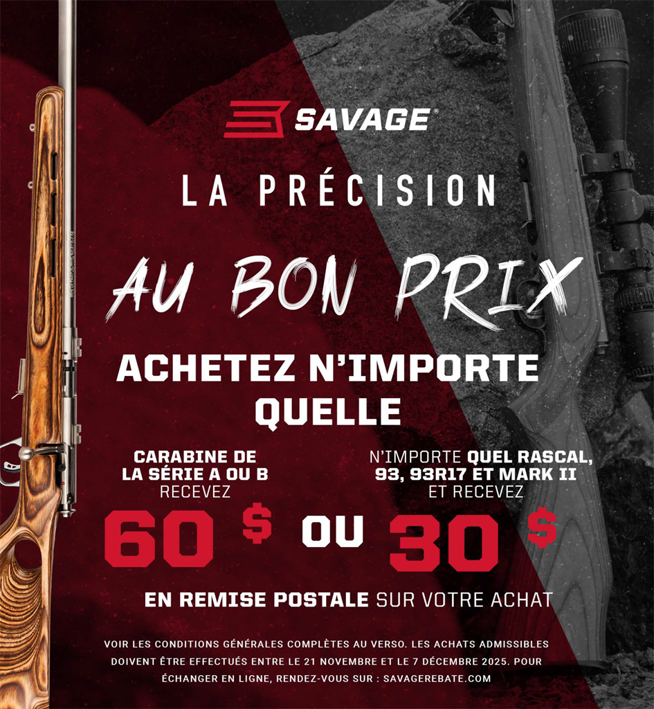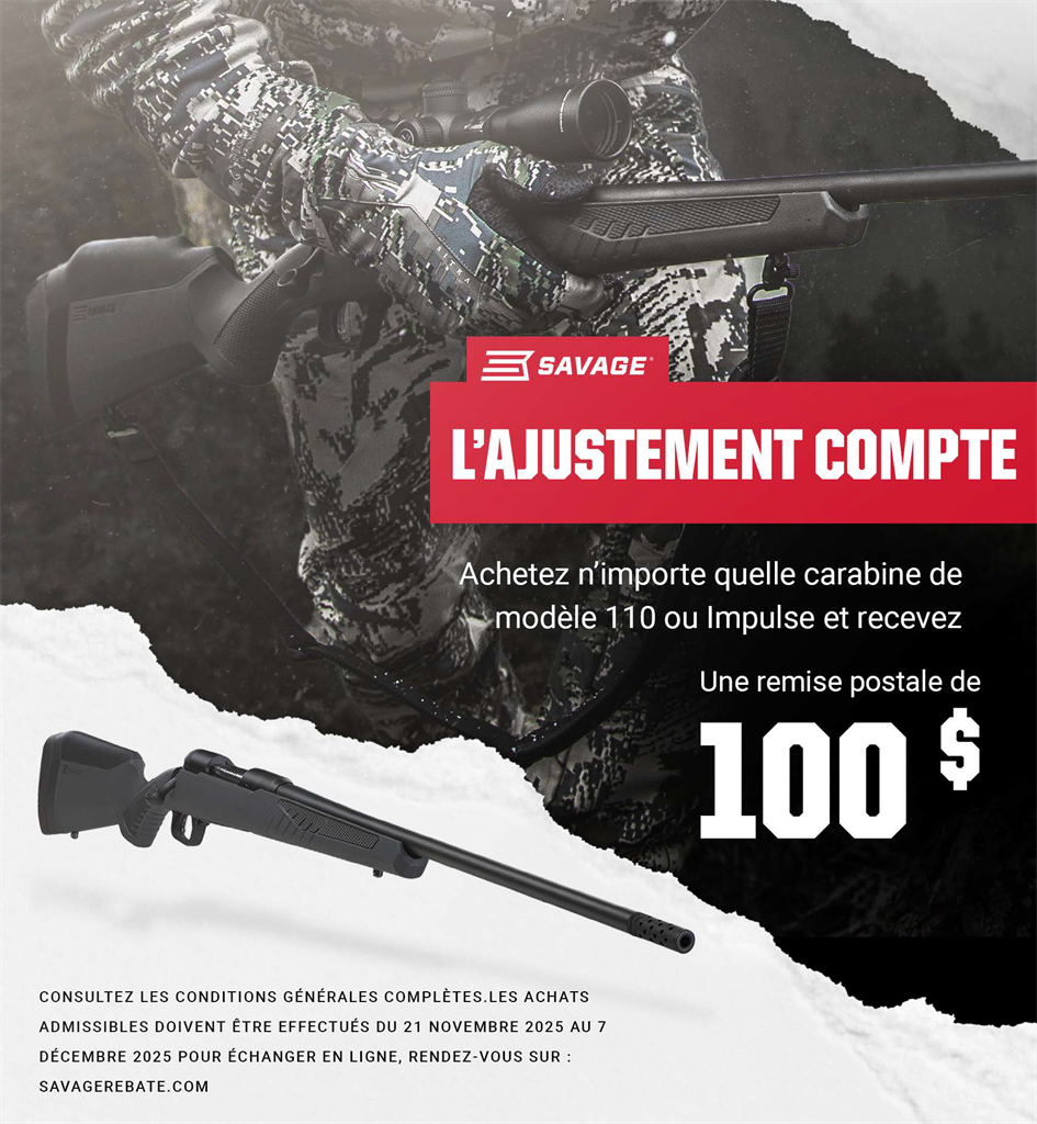 Achetez n’importe quelle carabine Savage 110 ou Impulse et recevez une remise postale de 100$.