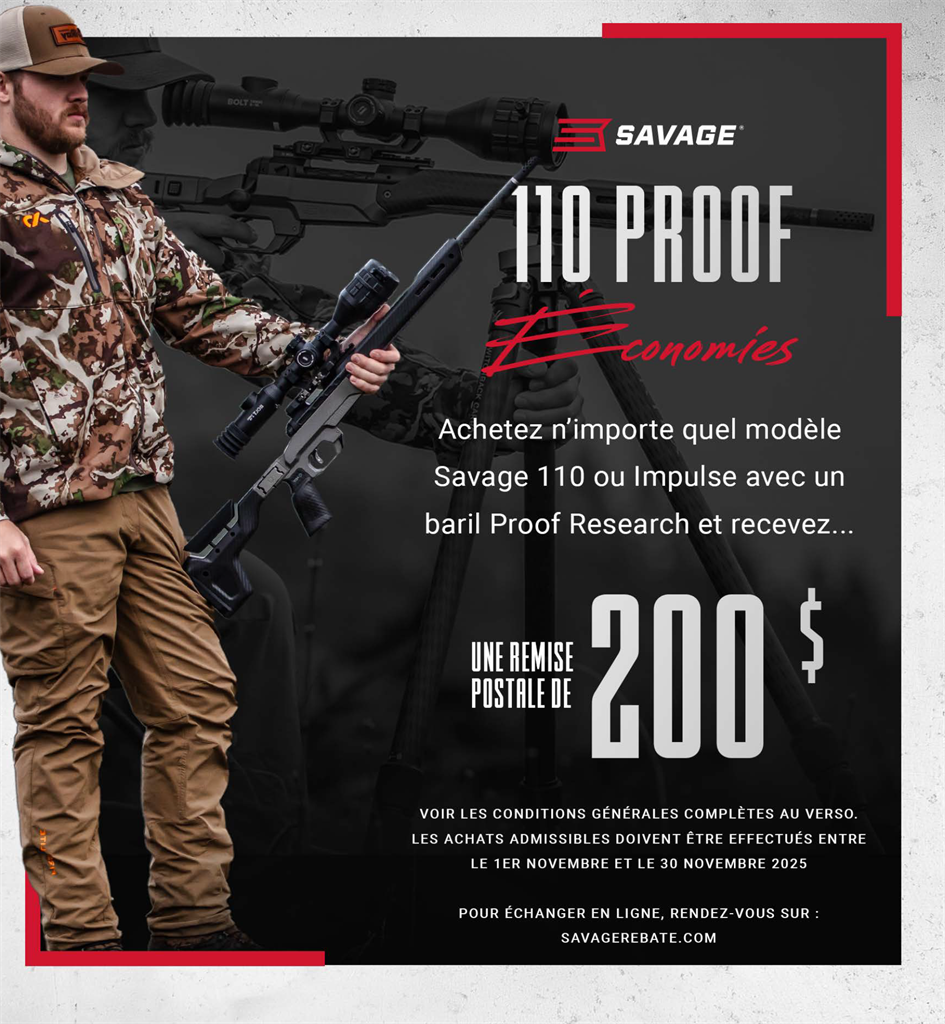Achetez n’importe quel modèle Savage 110 ou Impulse avec un canon Proof Research et une remise postale de 200 $.